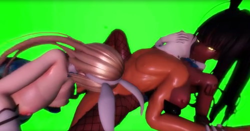 In this immersive AR threesome, a fully naked CGI man dons a stark white mask, his body exposed and aroused as two stunning anime vixens attend to his every desire. The blonde bombshell Karin, her long bunny ears twitching with excitement, kneels before him, her massive tits heaving as she twists her head to deepthroat his throbbing cock. She bobs up and down rhythmically, slurping and gagging with fervent intensity, her lips stretched wide around his shaft while saliva drips onto her ample cleavage.